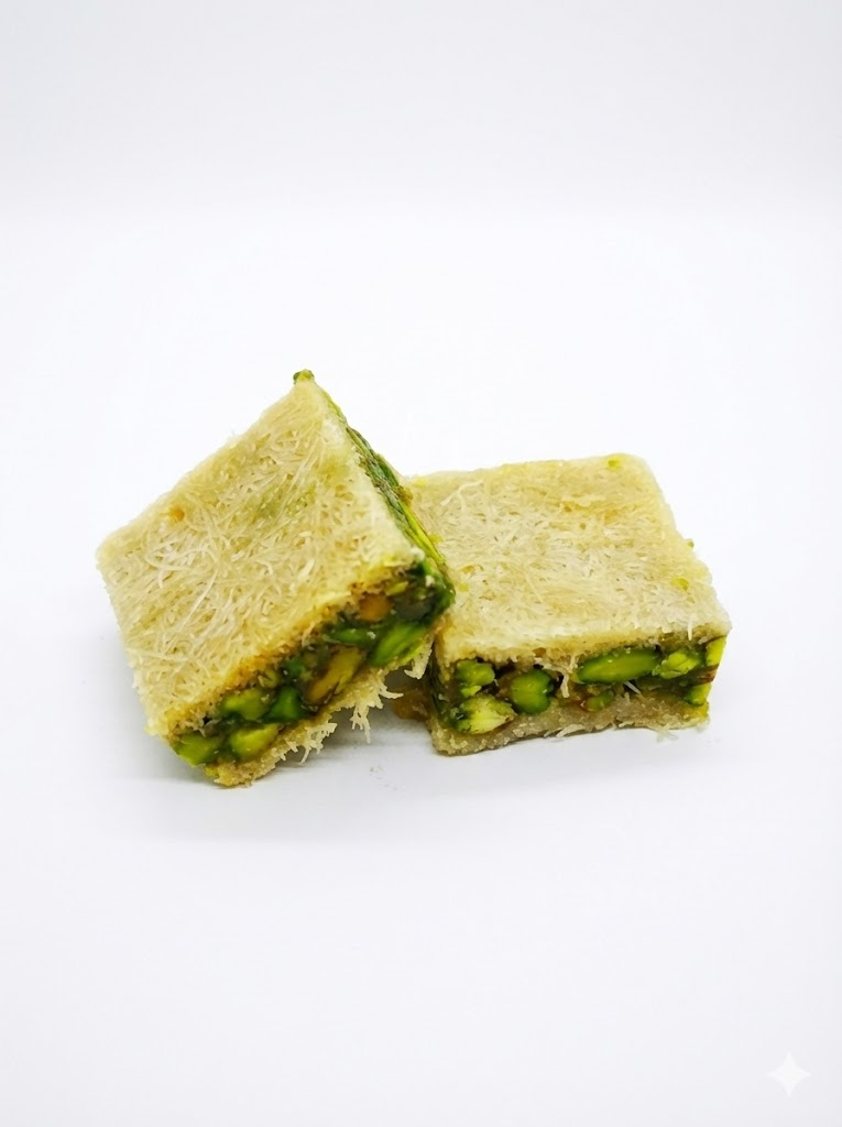 We prepare Baklawa Blorie with thin filo pastry, pure butter, and high-quality pistachios. First, we layer the filo sheets carefully while brushing each one with melted butter. This process creates the delicate, crisp texture that defines authentic baklawa. Next, we add a generous pistachio filling. The nuts bring freshness, richness, and a natural green color that enhances the dessert’s beauty. Then, we bake the layers slowly until they turn golden and flaky. During baking, the aroma fills the room and signals the creation of something special.