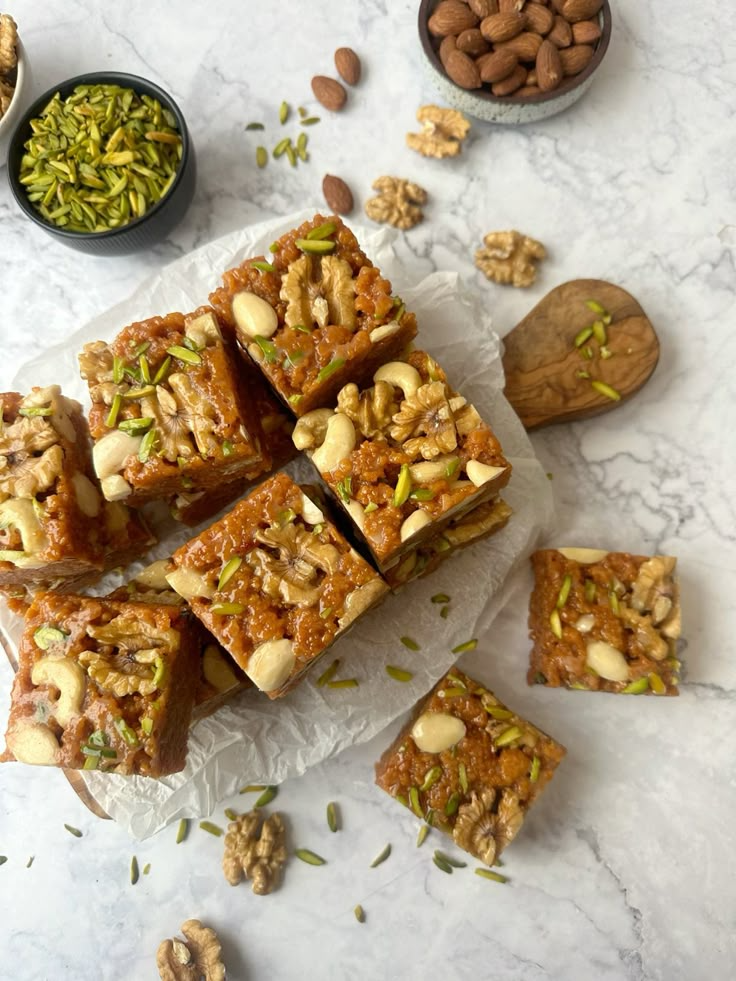 We prepare Sohan Halwa with pure ghee, sugar, milk, and a generous mix of nuts. The cooking process starts slowly. As the mixture heats, it thickens and begins to take on a caramel-like texture. The ghee blends smoothly with the sugar and milk, creating a glossy and rich consistency. The aroma fills the room and reminds you of classic sweet shops and winter evenings. Then, we mix in the nuts to bring crunch, flavor, and extra richness.